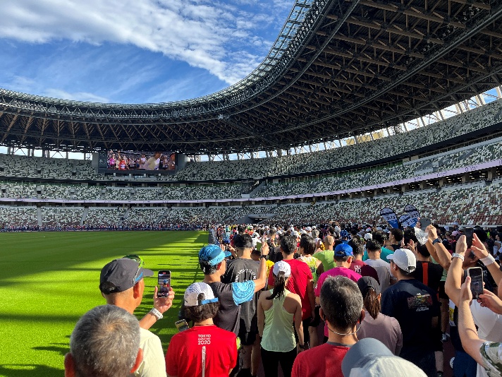 今回の 参加人数は15,000人ほどいて、スタートの号砲が鳴っても自分のいる後ろのブロックは一向に進まない。5分くらいしてようやく動き出し、いよいよ競技場内に入ると歓声が上がり、皆スマホで歩きながら撮影していた。